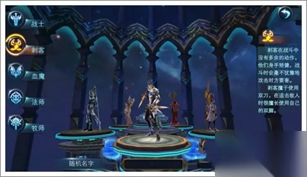 3、刺客:是近战输出职业,且其还具有很强的爆发力,可在短时间内对敌人造成高额伤害,但砸防御和血量较低,需要一定的技巧,而其转职方向可选择追猎者,影舞者;