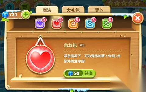二、急救包: 效果:紧急情况下,可为受伤的萝卜恢复1点额外的生命值!需要50宝石兑换。