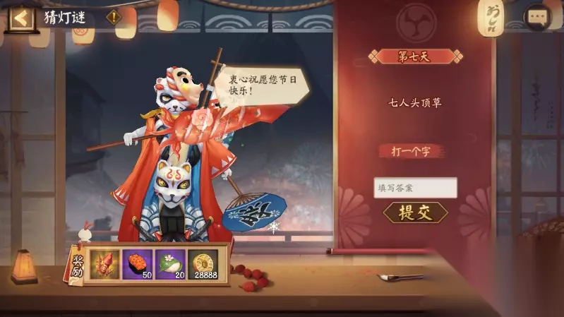 七天的谜底合起来就是白狐香岳一日花,谐音“白狐相约一日花”,是否预示着下一个新式神是SP白藏主呢? 接下来要出迦楼罗UP,可能迦楼罗UP一结束就要开启新区预告了,小编预计三周后新区新式神就要出来了。 阴阳师灯谜七人头顶草答案已经分享在上面,玩家们也都多了解一下这次灯谜的答案吧。