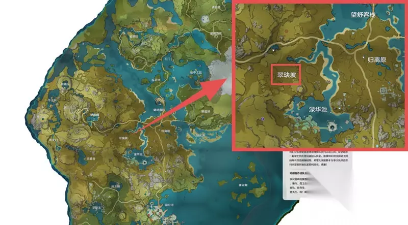 原神翠玦坡在哪呢?很多小伙伴在收集神瞳的时候都找不到这个地方,小编这里就给大家带来有关原神翠玦坡在哪的相关介绍,希望能够对大家有所帮助。 原神翠玦坡在哪 翠玦坡在原神地图中的位于璃月四大区域之一的碧水原,也就是在绿华池的左上方,具体位置如下图所示。 碧水圆是原神游戏中四大区域中的其中一个区域,同时也由多个区域组成,分别是:归离原、轻策庄、渌华池、明蕴镇、地中之盐、望舒客栈、荻花州、石门、瑶光滩以及翠玦坡。 在这些区域中,翠玦坡位于碧水原的绿华池的左上方,在归离原的左侧,在望舒客栈的左下位置。