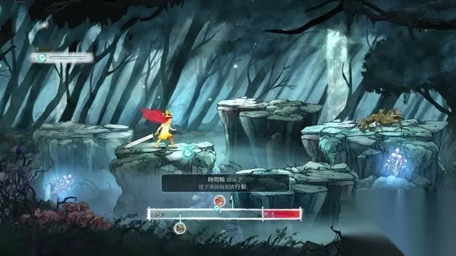 这时遭遇到一只怪物,进行第一场战斗,熟悉一下回合制战斗的机制。遭遇敌人有两种情况,一种是正常的遭遇,主角占有一半出手的先机。另一种是遭遇敌人的偷袭,那样敌人就在时间的优势。我方也可以偷袭敌人,方法是用萤火虫闪瞎敌人的氪金狗眼,这样可以跳到它们的身后来触发战斗,这样就能先动手攻击了。 在屏幕下方是时间槽,敌我双方在上面滑动,到达红色刻度的时候有布署指令的机会,达到终点的时候出手。在战斗中可用萤火虫来干扰敌人,按住鼠标左键在敌人的身上,可以使它们的速度减缓,这样主角就拥有较多的出手机会。 指令分为动作、逃跑、使用药水、队伍几种指令,其中动作中有攻击、防御、治疗几种选择。 杀死怪物会掉落一定的战利品,有药水、宝石、装备等。
