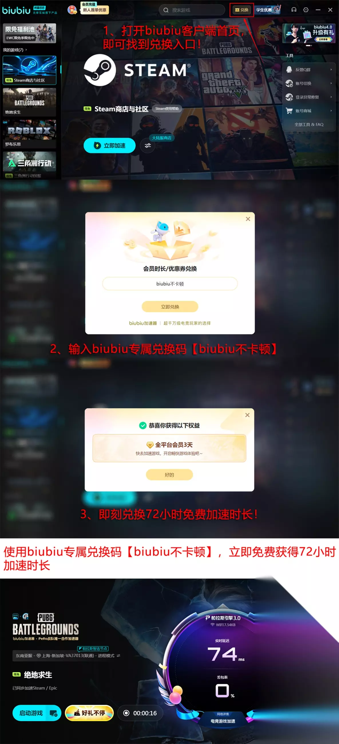在用户权益层面,biubiu加速器提供两项实用性较强的免费试用政策:其一,新注册账号可享连续24小时全游戏免费加速权限;其二,输入专属兑换码【biubiu不卡顿】,即可额外领取72小时加速时长,该福利不限新老账号,每位账号限用一次。两项叠加后,用户最高可获得总计96小时的无门槛加速体验,足以完成多轮完整赛季测试与深度功能验证。此外,平台内置社区模块同步开放,涵盖PUBG热门攻略、地图机制解析、载具刷新规律、跳伞落点建议等内容,用户亦可在社区内发起提问,获取即时互动解答。