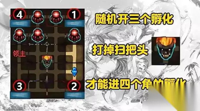 但进的门不1同,小地图从右上角开始顺时针计算,就是孵化1/2/3/4,每次随机刷出三个。核心注意事项,进孵化的前置要求是打掉中间金红色扫把头BOSS。