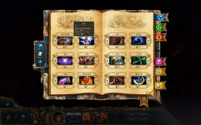 自然的呼唤 魔法效果:召唤随机一种总领导力为85的1-2级动物兵种为玩家作战。 法力值消耗:20 魔法效果:降低敌方单位的防御力30%,持续3回合。 法力值消耗:2 魔法效果:驱散友方目标的所有效果,随级别提升效果种类。 法力值消耗:5 魔法效果:联系两支友军,第一支受到的11%伤害由第二支承担,持续3回合。 法力值消耗:3 魔法效果:治愈友方目标50点生命,伤害黑暗或中立目标25点生命。 法力值消耗:3 最后的英雄 魔法效果:3回合内,部队受到伤害但是不减少数量。法术结束后统一结算。 法力值消耗:5 魔法效果:3回合内敌对生物会忽略受到庇护的部队。如果对敌人造成伤害,则法术失效。 法力值消耗:4 复仇者 魔法效果:施放于友方目标,攻击该目标的敌人会受到闪电反击。 法力值消耗:15 魔法效果:目标单位造成伤害时取最大值。 法力值消耗:10 龙之箭 魔法效果:弓箭手忽略射击惩罚,并忽略目标抗性和防御的30%。 法力值消耗:3 魔法效果:提升目标的愤怒等级,使其伤害和士气增加,主动性增强。 法力值消耗:8 魔法之斧 魔法效果:对目标造成100点物理伤害。 法力值消耗:5