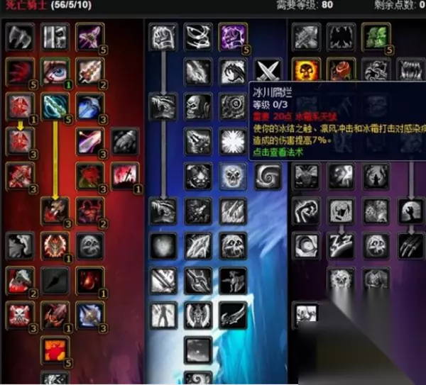 第三套是56/5/10,典型的加法,血天赋的终极天赋不点,血DK不差那点输出转化仇恨,当然,到时候竞速的话,看情况再决定加不加吧。如果要加的话,那么从邪天赋的蔓延上面腾一点出来给它。这是DKT的普遍加法,还有一个双光环血DKT的加法,这个不推荐,冰天赋的光环让冰DK去安排就好了。