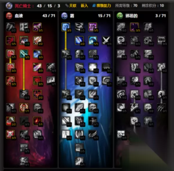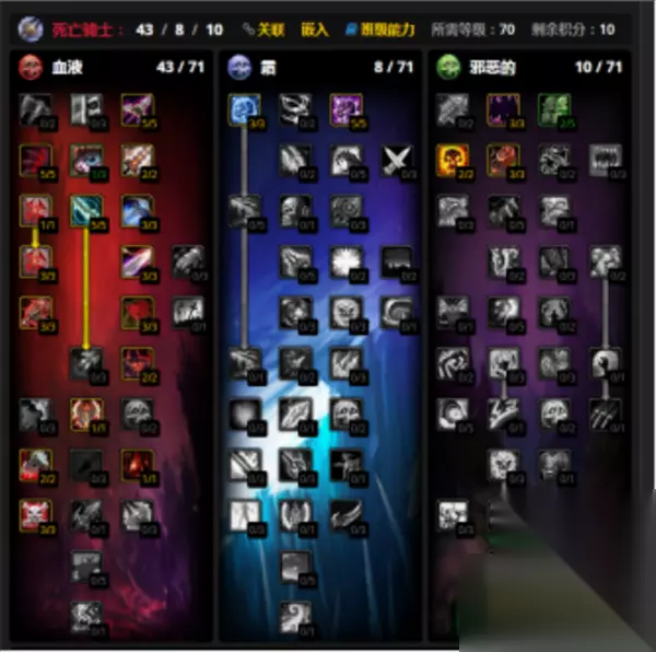 第二套是43/8/10,与第一套天赋的区别在于强化了邪恶系的疾病持续时间,同时点出凋零减冷却时间15秒,这在5H相当关键,而且多出了两点躲闪天赋。