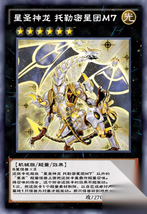 目前不知火比较多,拟声先手打不知火还是很舒服的,先手我我我妹妹检索电击,之后从手卡特召刷拉拉番长即可变星超量召唤做光子飞奔保镖了。保镖这张卡可以在对手场上怪兽发效果的时候把一个超量素材去除来无效那个效果同时炸500血,由于这一效果不仅可以阻止对手怪兽效果发动同时还不会破坏怪兽,因此堕武者、牛头鬼等卡牌将很难启动给不知火创造同调机会。 【星圣神龙 托勒密星团M7】