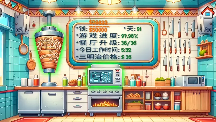 这是休闲模拟经营游戏《沙威玛传奇》的游戏展示,玩家经营沙威玛餐厅制作餐食招待顾客,在解锁全部自动化设备后实现经营解放生产力,展示了游戏进度与解锁设备后的经营场景。