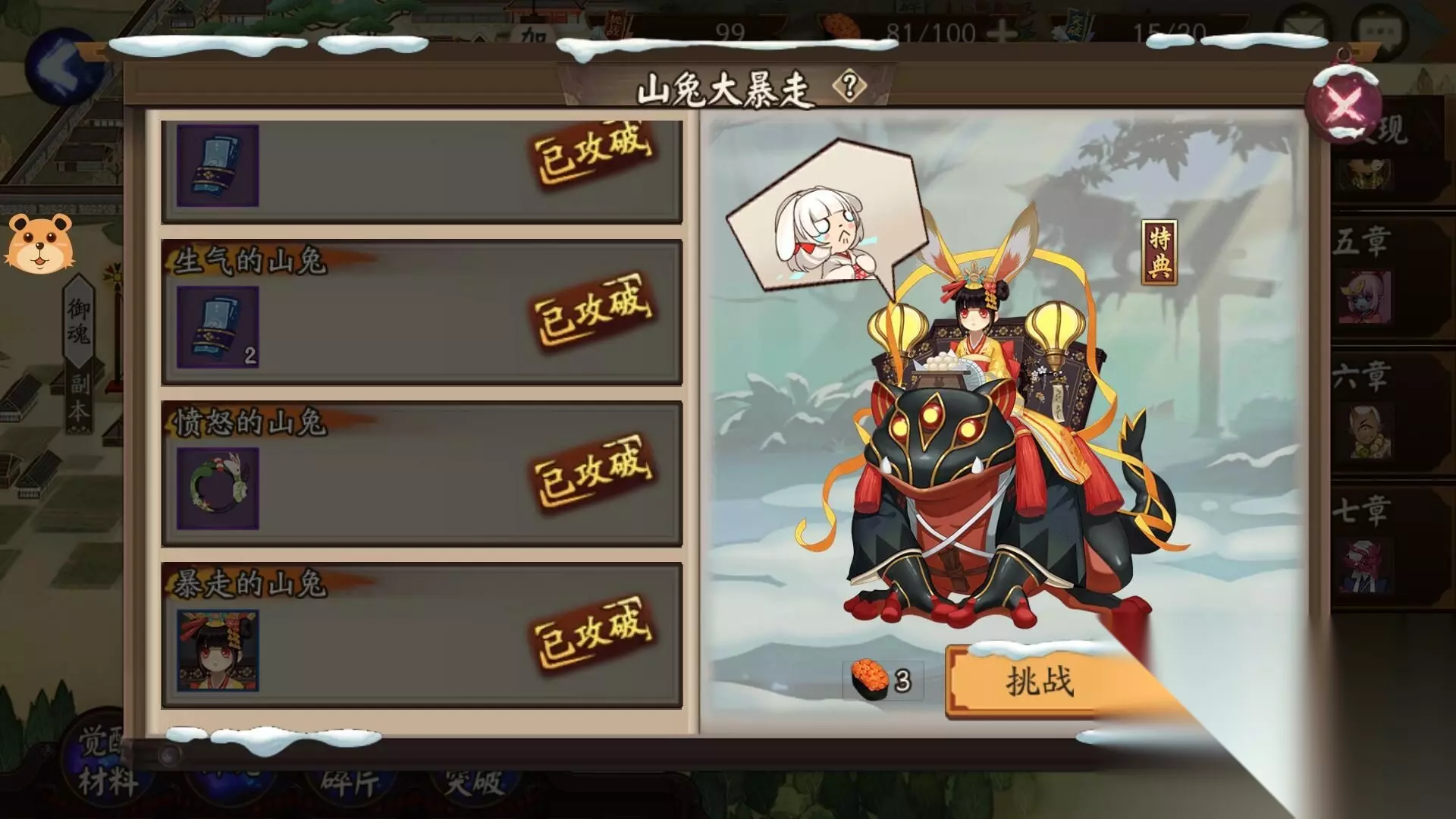 阴阳师秘闻副本山兔大暴走10层怎么过 1.最后面的大山兔大部分时间只会拉条和普攻,并且普攻并不是很痛 2.左右两边的山兔有时候会普攻然后马上接一个全体aoe,特别痛 3.桃花妖会优先复活大山兔 4.你的队伍一速,速度够快,只要没有大山兔拉条,可以超复活后山兔的车 好不容易出个活动,结果发现原来是个坑。在想是否会有彩蛋在里面,然后来打败这帮兔子。