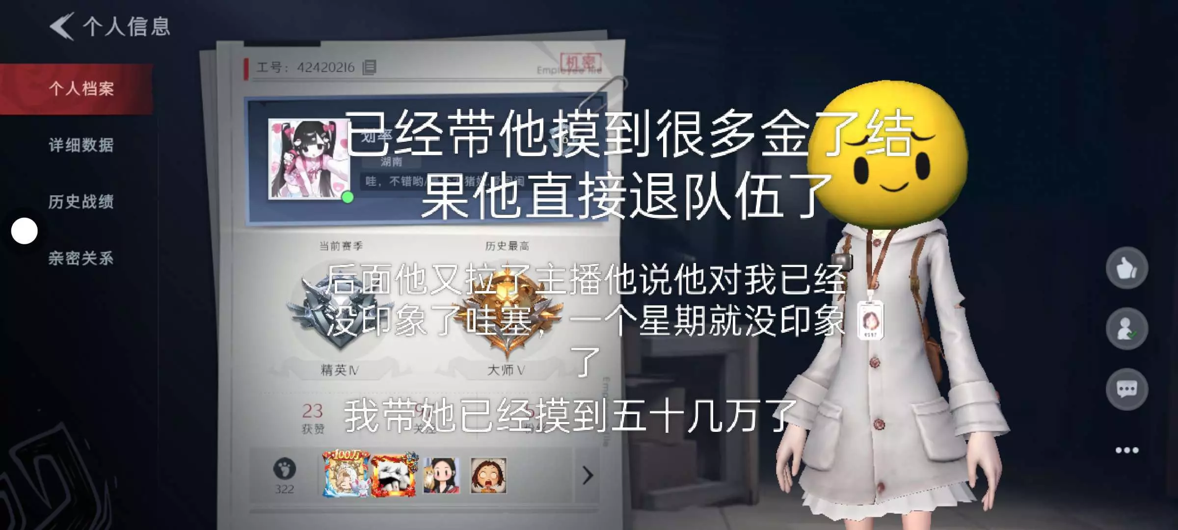 莫名其妙就忘本了我那个时候拉了个小萌新,就是他带他摸到大金已经数不胜数了最后只留了一个鬼喜给我自己😭😭😭我还没有想到他后面会忘本他说他很卡机,他就直接退了可是我看见他在跟别人玩我以为她是她的闺蜜或者别的朋友就没有多想直到后面他网一点都不卡我才知道,他就是不想跟我玩而已跟我玩就是为了蹭大金真的很烦,直到有一次我看到他在线,我就邀他了他还以为我是萌新就直接走了后面我才知道他早忘记我了,真的服了50万就呀