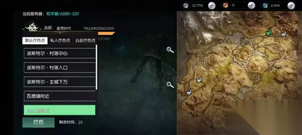 新手村无法造家,30级以下的萌新玩家可以选择送死,然后复活传送到达其他地方去造房子。死亡后可以选择很多疗伤点,我们主要是在默认疗伤点当中选择,点击后在地图上会显示出这个疗伤点的位置。