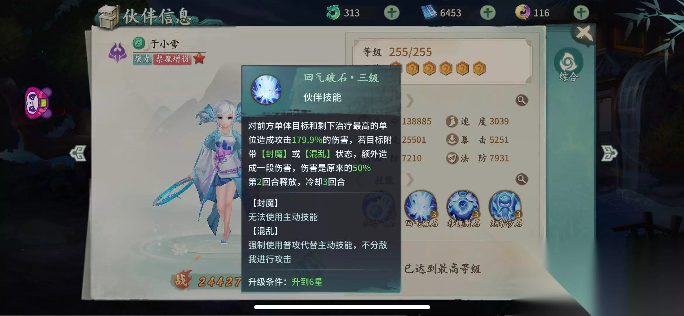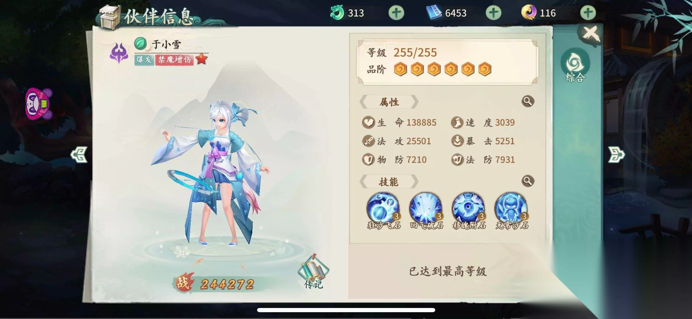 四、被动无常沙石 于小雪的四技能是一个被动技能,叫做无常沙石。在于小雪进入战斗的前三个回合里,于小雪的法术攻击伤害会提升百分之三十,但是相应的他对敌人施加的控制几率会下降百分之五十。于小雪的主要输出也就是在这前三个回合叠加上去的,使用于小雪的玩家也必须注意,必须在前三个回合打开敌人的缺口,不然于小雪的输出一旦降下来就会变得非常棘手了。