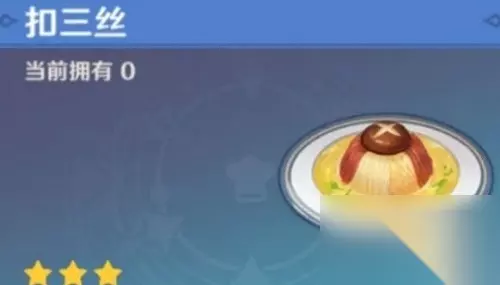 简单来说就是碗底加一株元气满满的香菇,再放入火腿丝、竹笋丝与煮熟的鸡胸肉丝,并拼成碗型然后塞满内部,烹饪一番倒上本调好的鸡汤,其三者食材最为重要的一种便是冬笋啦,竹笋本就是神秘又偏僻的食材,所有爱者传承五花八门的厨艺也就是纪念家乡的味道。 所以大家还需知道采集竹笋的位置,那么这样的一款人间美食俗称为扣三丝。食谱可在璃月港万民堂卯师傅菜店购买,售价5000。
