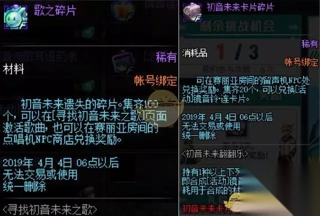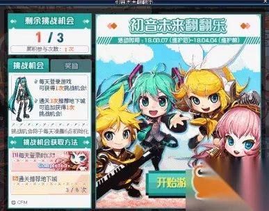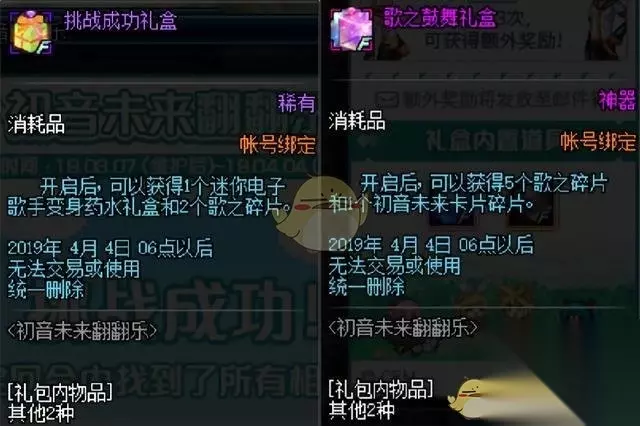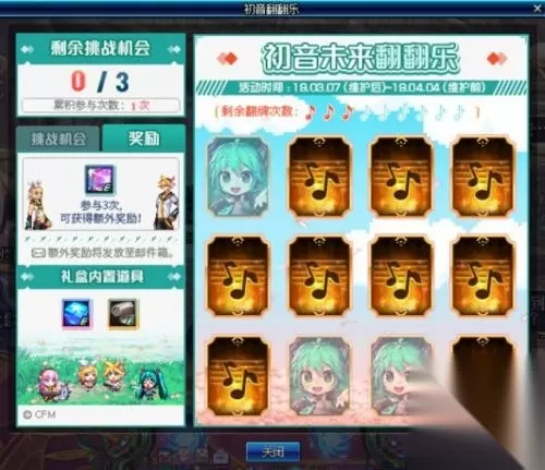 挑战成功可以获得1个迷你电子歌手变身药水礼盒和2个歌之碎片,如果成功挑战3次可以获得额外奖励5个歌之碎片和1个初音未来卡片碎片。