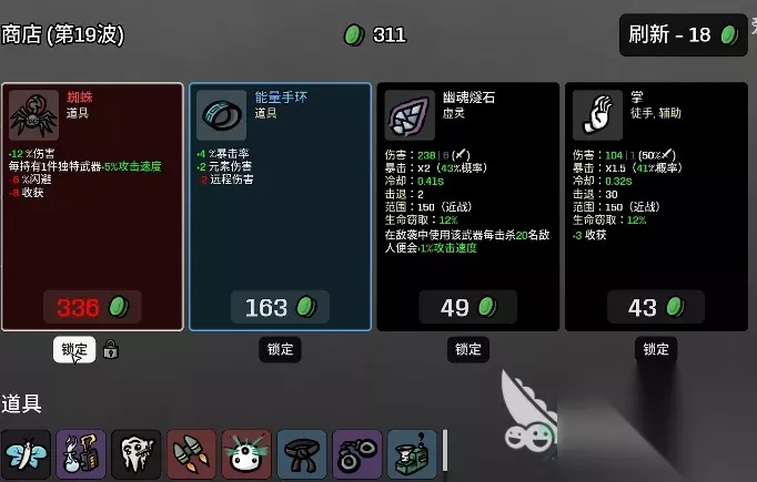 道具挑选:首要比较引荐的有“蜘蛛”,这个兵器和鬼魂自身也是非常符合的,能够一起进步损伤与攻速,无论是输出上限仍是输出频率都起到了极大的进步,尽管它会削减一些闪避和收成,但考虑到鬼魂自身的闪避其实是略显溢出的,所以这点丢失也无伤大雅,比照其带来的增益肯定是利大于弊的。