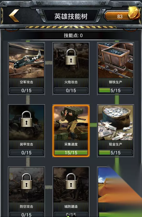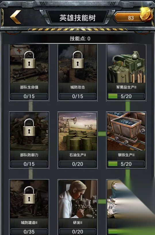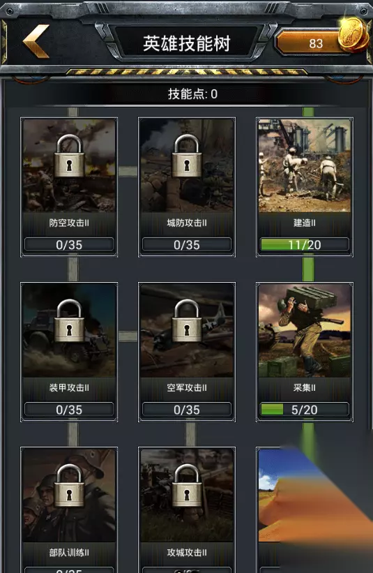二战英雄技能加点怎么加点呢?往哪方面发展才是最好的选择?下面就给大家带来的详细加点方法吧。 发展型:主点采集、建造、研发和部队训练,经济类和攻击类的技能可以先不点,等战斗的时候再把点洗了,换成攻击型的技能点。 发展型的加点根据需求的不同以及技能点的数量选择性的点满其中的一个或多个。比如采集活动的时候,优先点满采集|和采集||这两个,剩余的点根据需求再进行分配。造兵活动需要兼顾资源采集,优先点满部队训练|和部队训练||这两个,剩余的点再分配到采集和其他技能上面。 攻击型:主点各个兵种的攻击、部队生命值、部队防御。 攻击性的加点可以先把一个兵种的攻击点满,然后再慢慢延伸到两个、三个兵种,攻城攻击这个技能的可以最后再点,优点点满每个兵种攻击的第二个等级技能,就是后面带||的,然后再点部队生命值和部队防御。 注意:加点中有采集||、建造||、研发||以及其他技能的第||等级技能都是优先点满的,其他的点够前置,也就是点够可以往下点的要求就可以了。 为什么要这样呢?因为技能||点满后加成是比较高的,比如空军攻击||点满有54%的加成,建造||点满有65%加成,采集||点满有135%的加成,这个什么概念不用多说了吧。 下面给大家分享一个前期发展型的技能点发,可以参考一下。