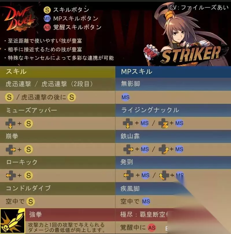 《地下城与勇士:决斗(DNF Duel)》中的散打是游戏里非常好用的女格斗家职业,一觉和二觉的名字分别叫武神和极武圣,招式用起来也是非常不错的,出招表如下图,S是技能按键,MS是MP技能按键,AS是觉醒技能按键。