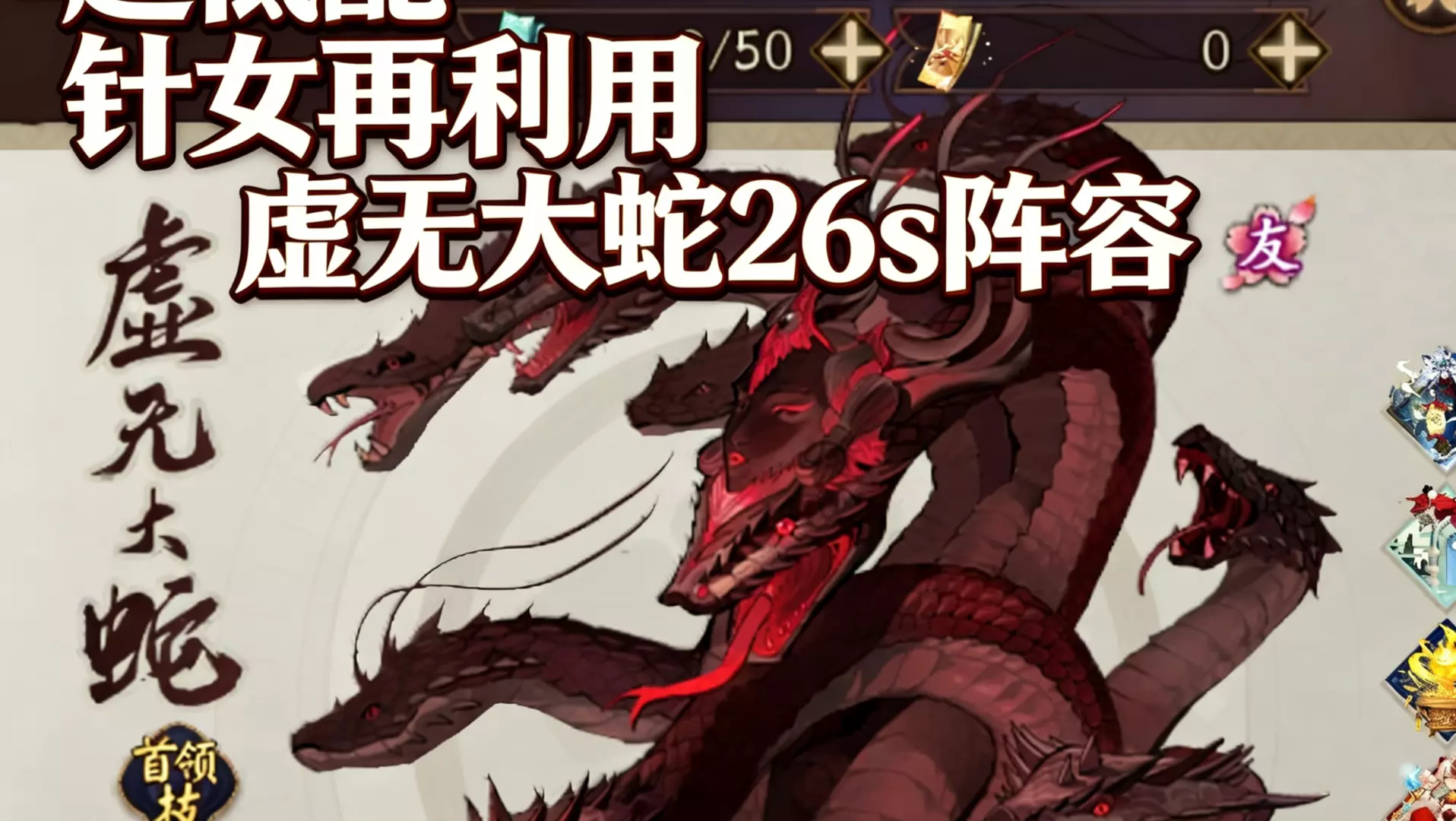 这是一篇阴阳师虚无大蛇的低配阵容攻略,无需新式神和特殊御魂,可达成42~57秒通关,还展示了季、天照等式神的御魂搭配细节,附带阵容码可直接导入。