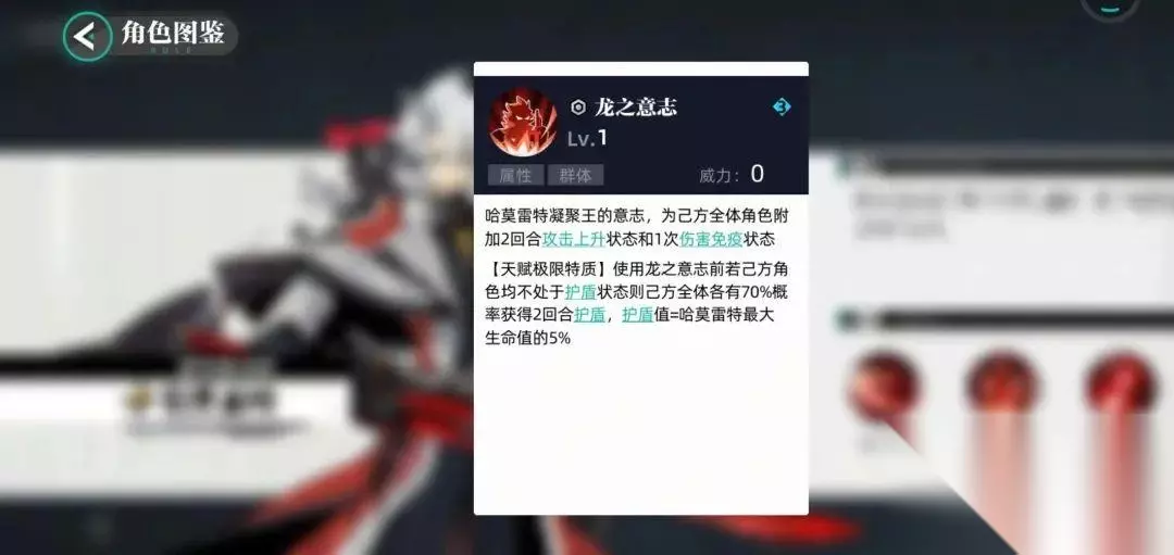 技能2龙之意志(能量消耗3) 能给友方增加增益(两回合攻击力增加和一次伤害减益)在打BOSS时这是个非常不错的技能,在能量足够时,释放两次可以让BOSS的攻击打在身上不痛,还能增加友军的攻击力。