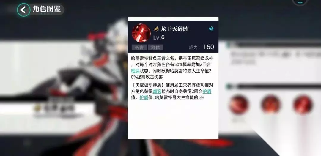 技能3龙王灭碎阵(能量消耗3) 固定伤害160,同时有概率附加嘲讽以及附加自身血量上限百分之20的伤害,这个应该是游戏内伤害最高的技能之一了,而且加上哈莫雷特血量越高,伤害就越高。