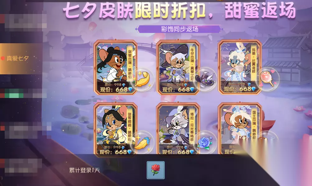 亲爱的小伙伴们, 甜蜜浪漫的七夕节就要到了,为了迎接这一传统节日,猫猫鼠鼠们也是纷纷换上了七夕主题装扮,向心爱之人发出约会邀请呢。 本周更新后,6款七夕主题皮肤将限时上架商城!在这充满爱意的节日里,几对惹人艳羡的情侣通通甜蜜来袭,小伙伴们准备好迎接这波糖分了吗? 七夕主题皮肤限时返场 浪漫七夕,与你再会。8月8日-8月18日的活动期间,七夕主题皮肤将开启限时返场,喜欢该主题风格的小伙伴可前往商城进行购买~