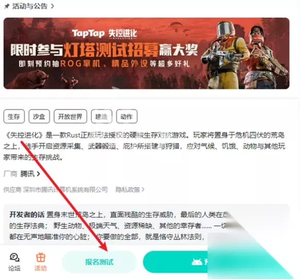 3、还需要绑定手机号,最后再点击一次“报名测试”即可跳转至调查问卷,填写完成即可。 taptap申请 灯塔测试问卷地址:点击前往 taptap入口:点击前往 申请步骤: 1、点击上面这个链接跳转至taptap失控进化游戏界面。 2、接着点击下方的“报名测试”,填写问卷即可完成。