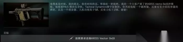 点击查看详情>>>《逃离塔科夫》枪匠任务10怎么改 枪匠任务10攻略 【枪匠-11】 关键字提取:一把Vecto 9X19 冲锋枪,MK5模块化导轨,TD镂空前握把