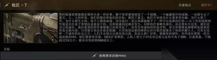 点击查看详情>>>《逃离塔科夫》枪匠任务6怎么改 枪匠任务6攻略 【枪匠-7】 关键字提取:一把M4A1突击步枪,需要消音器,60发扩容弹匣,人机工效大于47