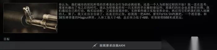 点击查看详情>>>《逃离塔科夫》枪匠任务5怎么改 枪匠任务5攻略 【枪匠-6】 关键字提取:一把AKM突击步枪,需要Fortis shift握把,需要消音器,需要magpul的30发弹匣