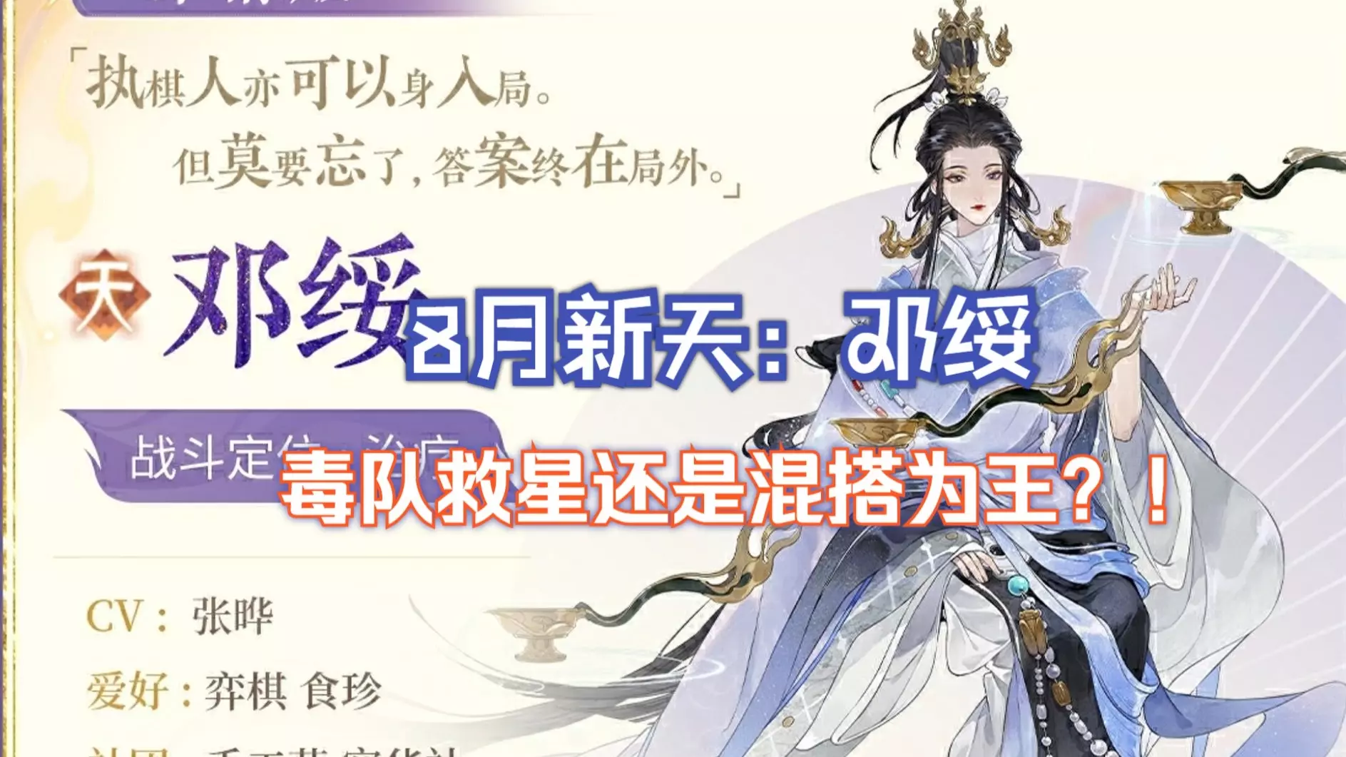 可能是目前忘川全名士里设计最复杂的一个了。 PVE没得说,神中神。PVP到时候出了多测试一下,强度太难脑测了,但是目测最后还是走混搭而不是纯毒。 (◕ᴗ◕✿)