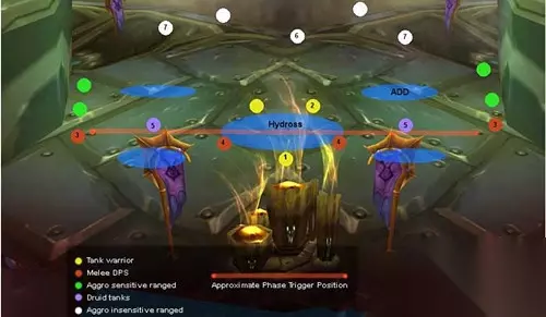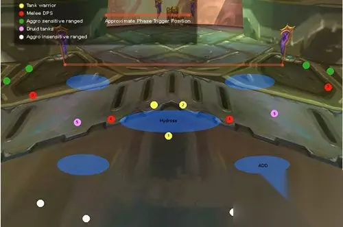 黄点:战士TANK 红点:肉搏DPS 绿点:仇恨敏感远程(法师等无消减仇恨技能的职业) 紫点:德鲁伊TANK 白点:非仇恨敏感远程(猎人等有消减仇恨技能的职业) 红线:阶段转换线 毒性/自然阶段的开始,四个自然系伤害小怪刷新,冰抗坦克转换至自然抗坦克。这个阶段持续至250%自然易伤前10秒,整个阶段大约1分钟左右 这个示意图标明了在毒性阶段(第二阶段)开始后队员的站位。当BOSS的属性转换,小怪刷新,坦克从1移动到2,当小怪被干掉,3和5移动到4。转换到水系阶段前5秒,BOSS由坦克拉到水系阶段示意图上的触发点(这时TANK只需要退后几步就可以实现属性转换)。转换属性后的5-10秒内,德鲁伊TANK必须移动到第三阶段示意图上的紫点,非仇恨敏感远程需要立刻散开。 这个阶段的站位比较灵活。 海度斯会从蓝色转换至绿色并召唤四个爪牙,这些爪牙对于坦克以外的队员可以一击必杀。一个法师在四个爪牙出现前站在四个刷新点的中央,在它们冲过来之前用冰环冻住,再立刻闪现到安全的地方。这时德鲁伊上前拉住它们并集中至海度斯的身下,所有DPS等待5秒,再协助之前定好的队友全力将小怪逐个速度干掉。在干掉小怪后,在阶段转换前有大约20秒的时间来DPS boss。阶段转换前(250%易伤印记前5秒),DPS和MT的主治疗必须移动到毒性转换线的东面,如站位图所示。与此同时,德鲁伊TANK也要移动就位准备下一波爪牙,DPS暂停攻击直至阶段转换。MT再次切换,自然抗MT向后移动跨过触发线直至海度斯变色,第二阶段结束。 第三阶段