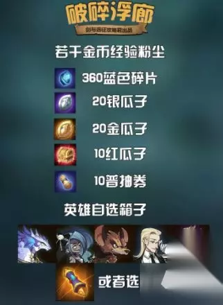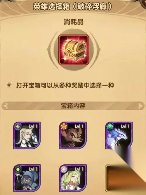 奖励道具依旧是那些东西,而英雄箱子的话各位取自己缺的那个英雄即可,本期箱子里面的英雄强度都还可以。 进入剑与远征后,点击左下方的野外选项,选择奇境探险的图标,点击上方的破碎浮廊关卡进入,分别点击下方的宝箱,可以看到终极宝箱为英雄选择箱,可以选择下图中任意一个,点击右侧的宝箱后,可以查看到该关卡的探索奖励。