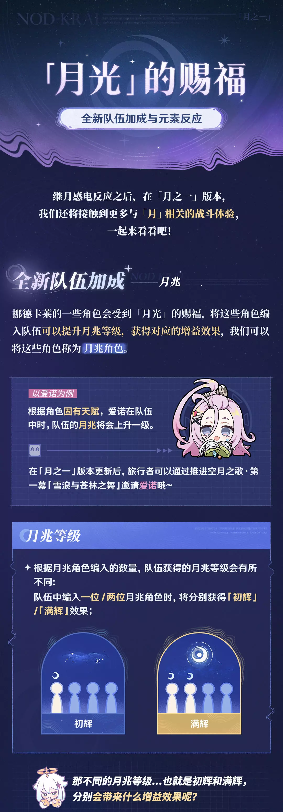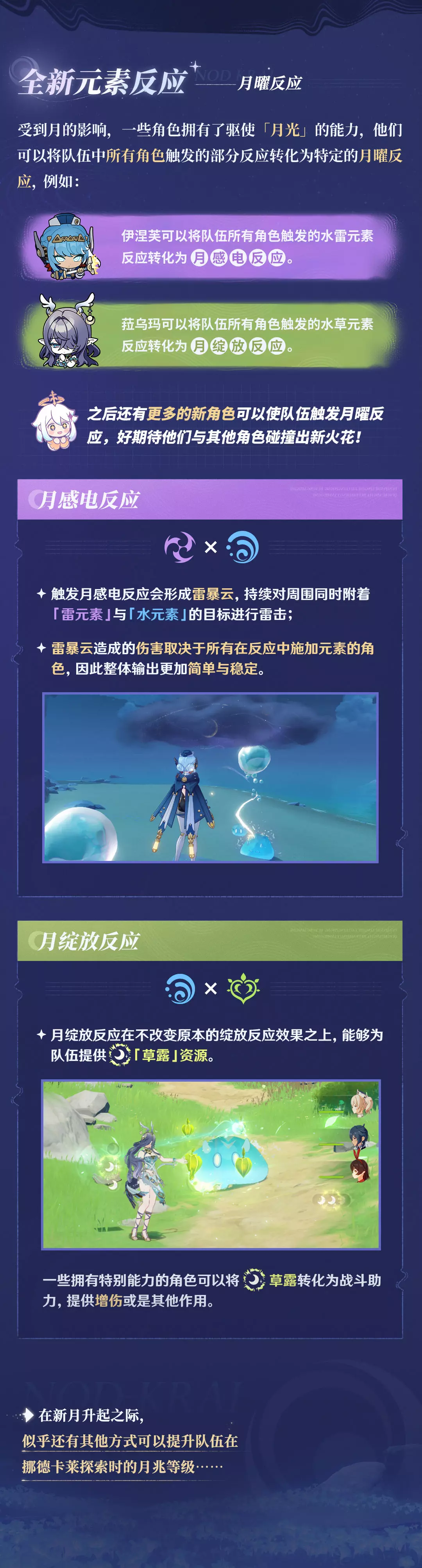 受到古月遗骸的影响,挪德卡莱并没有以七元素中的任何一个作为地区的主导,而是充斥着一种古老的元素能量,长久生活于此的人们也在适应并尝试运用这份属于「月光」的赐福……