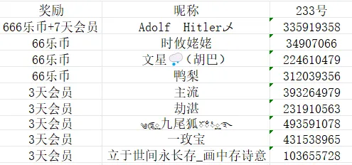 由于正确回复不足开奖,奖励减少,恭喜以下逆行者获奖