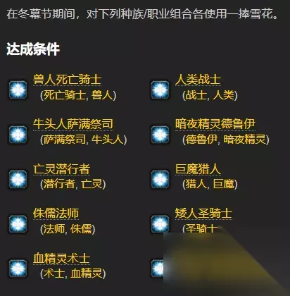 3、雪花纷飞 在冬幕节期间,对下列种族/职业组合各使用一捧雪花。