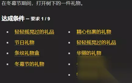 7、奥格瑞拉,铃儿响叮当 在冬幕节期间,骑在飞行驯鹿身上完成“继续轰炸!”任务。 8、真讨厌 完成夺回被偷走的烟林牧场礼物的任务,并获得烟林牧场的感谢。 9、兄弟情谊 在冬幕节期间,对部落的“兄弟”使用槲寄生。 凯尔坦修士:冰冠冰川(63.5,42.9) 杜尔克特·狼脉:北风苔原(40.3,55.0) 马拉奇修士:幽暗城(50.9,21.7) 10、他知道你是不是乖孩子 在冬幕节期间,打开树下的一件礼物。