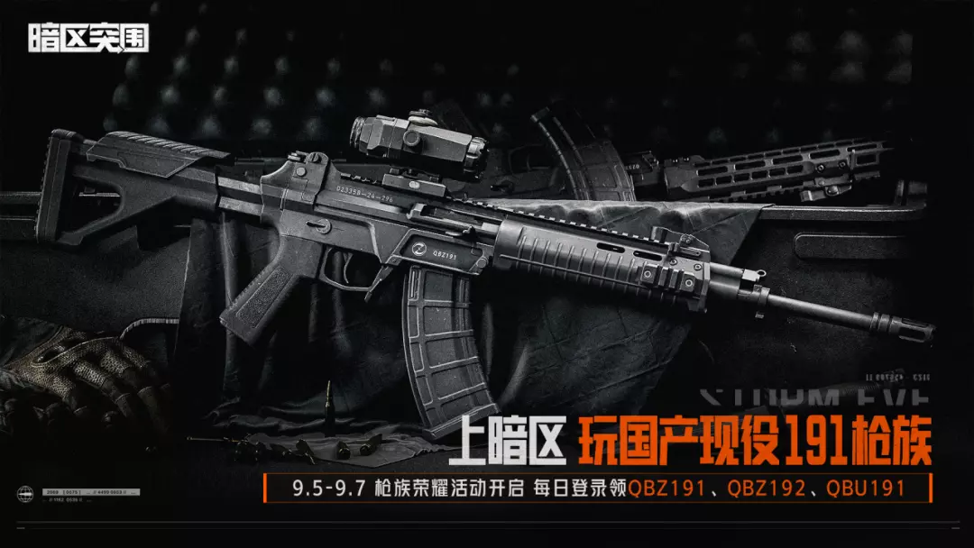 上暗区,玩国产现役191枪族!9月5日-9月7日枪族荣耀活动开启,每日登录即可领取国产现役191枪族枪械一把!完成三日登录,QBZ191、QBZ192、QBU191三把国产枪械免费领!