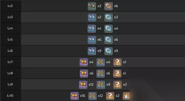 2级:天光的教导*3+破旧的刀镡*6 3级:天光的指引*2+影打刀镡*3 4级:天光的指引*4+影打刀镡*4 5级:天光的指引*6+影打刀镡*6 6级:天光的指引*9+影打刀镡*9 7级:天光的哲学*4+名刀镡*4+暂时未知*1 8级:天光的哲学*6+名刀镡*6+暂时未知*1 9级:天光的哲学*12+名刀镡*9+暂时未知*2 10级:天光的哲学*16+名刀镡*6+智识之冕*1+暂时未知*2