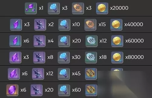 40级:最胜紫晶碎屑*1+海灵芝*3+破旧的刀镡*3+2万摩拉 50级:最胜紫晶断片*3+龙嗣伪鳍*2+海灵芝*10+破旧的刀镡*15+4万摩拉 60级:最胜紫晶断片*6+龙嗣伪鳍*4+海灵芝*20+影打刀镡*12+6万摩拉 70级:最胜紫晶块*3+龙嗣伪鳍*8+海灵芝*30+影打刀镡*18+8万摩拉 80级:最胜紫晶块*6+龙嗣伪鳍*12+海灵芝*45+名刀镡*12+10万摩拉 90级:最胜紫晶*6+龙嗣伪鳍*20+海灵芝*60+名刀镡*24+12万摩拉
