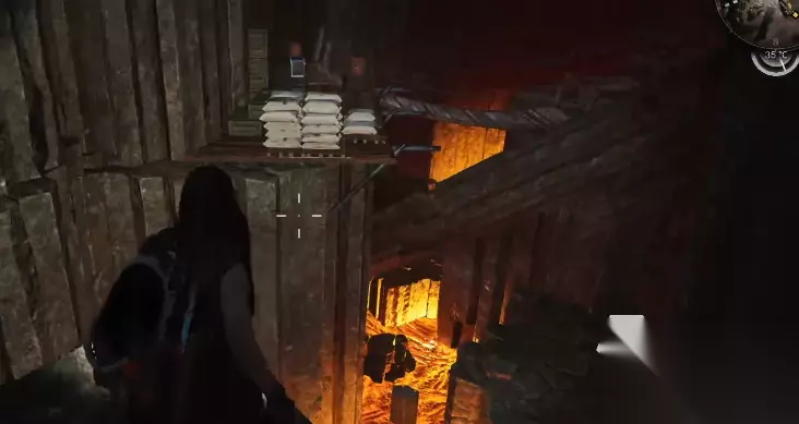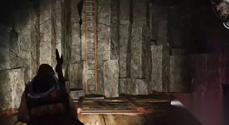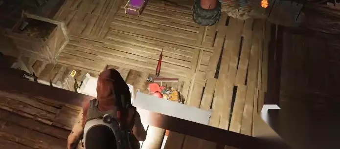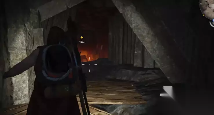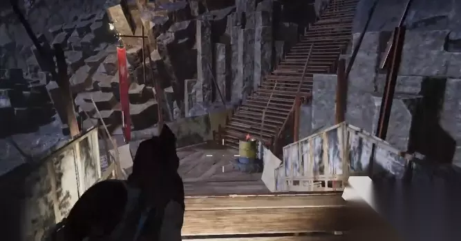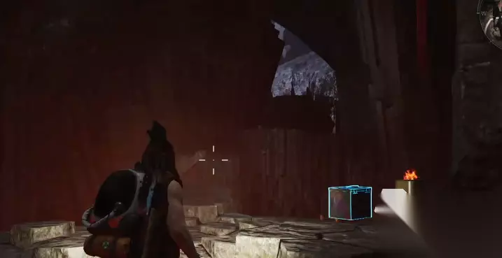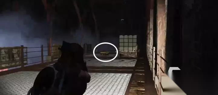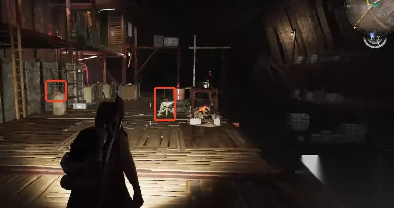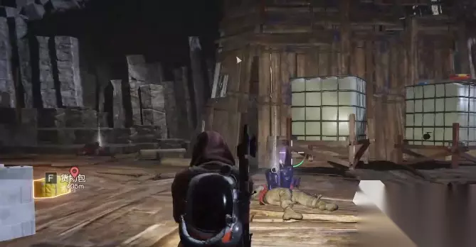 左边有一个通道,通道的尽头有一个装备箱,拿完装备箱之回头,原路返回,在之前顺着木板台阶上来之后的位置向右手边走,这块有个口子。