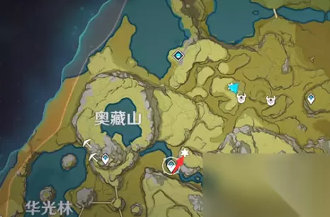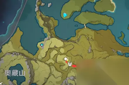 奥藏山 接着是在奥藏山右下的位置来进行传送,到了就在后面的山上爬上去就能看到。
