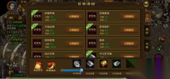 征途 太庙搬砖怎么做?在哪接任务?在哪交任务?详细 每个国家的王城都有一座代表国家昌盛的太庙,太庙的建设需要全体国民的努力!每天12:00——23:59等级达到90级的玩家,可以去外国太庙搬砖。 1、太庙需要砖块支持,把砖块拿回本国太庙将可提升其等级。 2、把外国太庙砖块运回本国,搬1块砖,被抢夺国的太庙资源减少1块,抢夺国的太庙资源增加1块。 3、当砖块达到1000块时可以方便的通过王城车夫到达中立区皇城安全区,并且当砖块达到3000块和5000块时本国国王、城主将获得更多的管理费,如此时砖块不足1000块就要长途跋涉从边境去皇城。 4、当天本国砖块降到200块以下(含200)时,第二天国王、城主获得城池的管理费将减少,并且税金会增加至11%;当天本国砖块降到0时,第二天国王、城主获得城池的管理费将减少,并且税金会增加至12%。 5、太庙搬砖不限次数,但只有前三次完成后有经验奖励。当玩家太庙搬砖时,将有几率获得额外的经验奖励。 6、如果本国太庙的砖块数量为当天所有国家最少的,那么在第二天该国家将会受到保护,别的国家无法抢夺受保护国的砖块。 7、当本国太庙资源达到1000块以上(包括1000)时,在本国王城车夫处将增加可以跳转到“世外桃源”的功能。去太庙资源1000块或1000块以上的国家搬砖,完成任务后可获得更多经验。 8、玩家去太庙搬砖将会有一定几率搬到紫、绿、黄、蓝各色彩色砖头,获得不同的经验奖励。搬到紫砖可获得3倍的经验奖励。 9、在敌国获得“太庙资源”后,如对“砖”的颜色不满意可至该国王城NPC“太庙石匠”处进行更换。当重新“搬砖”后,换砖的等待时间将重新计算。也就是说,每次更换后需等待一段时间方可继续更换,但每更换1次都将增加等待时间。 10、每天24:00太庙资源排名第一的国家将迎来更多的挑战,其他国家国民可以在0:00-24:00中的任意时间内夺取该国太庙资源。 11、国家搬砖:各国家国王,宰相和御史大夫,每天均可在NPC“史官”处发布1次“国家搬砖”状态。“国家搬砖”状态下,玩家每次完成“太庙搬砖”任务的经验都将提高50%,该状态可持续2小时。 12、根据“国家综合实力排行榜”上的名次,将会调整玩家获得高品质“太庙资源”的几率。其中,大幅提高玩家在1-3名的国家搬取“太庙资源”时,获得“彩砖”的几率;而玩家在4-6名的国家搬取“太庙资源”时,获得“彩砖”的几率也会有一定提高。 好玩有趣的“宝藏图”功能 在完成“太庙搬砖”任务时,都可获得一张“羊皮碎片”,每个角色每天最多可获得3张“羊皮碎片”。当玩家集齐3张“羊皮碎片”再加上3把非绑定的“密银之匙”即可在王城NPC“绘画师”处兑换一张“宝藏图”。玩家可根据宝图上提示的坐标找到并挖出“补天神石”等极品道具奖励。 征途2新手怎么搬砖 快速搬砖赚钱技巧攻略 【开放时间和地点】 太庙搬砖是日常任务,玩家等级达到60级,在每日的11:00-24:00间,可前往敌国太庙完成3次搬砖。 【国家搬砖】 由国王、宰相、御史大夫指定目标国家发布国家搬砖活动,国家搬砖活动持续30分钟。国家搬砖活动每天1次,国家搬砖活动期间,换砖冷却时间减半。 【怎么搬砖】 先前往本国太庙,点击雕像后选择国家,然后选择组队或者独自搬砖,前往敌国太庙后进行搬砖和换砖操作,完成后回到本国太庙交付任务,领取奖励。每日仅有前三次搬砖任务有奖励。 【搬砖奖励】 完成搬砖任务可以获得拼图碎片,若不满意当前获得的拼图碎片,可以再次完成搬砖任务进行刷新。 【搬砖技巧】 国家搬砖活动时间内,搬砖时间减半。 组队进行太庙搬砖任务可以增加换砖次数,队友换取的砖块品质全队享用,需都在附近参与搬砖活动。 砖块的品质为白砖、蓝砖、黄砖、绿砖,绿砖品质最高。交付砖块的品质越高,获得的经验、魂魄石奖励越多。 完成今日3次搬砖者,可继续搬砖,不会有任务奖励。 玩家在3次任务后搬到黄色以上品质的砖可以留到次日交付,节约次日任务时间。黄砖可以提高人物攻防属性3%,绿砖可以提高人物攻防属性5%。 国家官员有直接获得绿砖奖励的福利。 征途怀旧版如何赚钱 问题一:征途怀旧版怎么赚钱啊? 你们玩过怀旧版没?竟瞎说,怀旧现在赚钱太难了.有个征途还没封的方法,用老账号冲新区,45级领1D工资,不过到60级才能使用.60级时打装备拆材料,卖出再冲新区.一次能有280D左右.升级过程中还可以刷点别的.别值望刷书刷石头赚钱,那是不可能的 问题二:征途怀旧版怎么 赚钱? 开六个号,在开区星期一进王,领珠子,刷怪,卖垃圾,刷到60级,把5个号送的工资领出来,打42级项链,再拆掉,把材料转给一个号绩打60+天之一套,再找个人民币玩家家族,以你身上的装备也够了,晚上挂机从12点到早上10点左右,中午下班来再开5个小号带荣誉,带到下午下班,下午下班拉拉镖,做做刺探,第二天用荣誉换双倍再去刷怪,等级有可能会超过一般人民币玩家,主要是要有流程化 问题三:征途怀旧版如何占领NPC,如何快速赚钱? 自己建个家族 然后去没人占领的NPC去占领他就可以了 要是都被人占了 那就去抢一个 占NPC需要花费2D 不过每天族长可以领取40L 怀旧版挣钱那就是 练几组小号 刷垃圾 练大号打BOSS 刷垃圾卖垃圾还是比较赚钱的你去买个征途小妖精外挂这样小号就会自动去卖垃圾 还能自己设置存贮绿装 材料等等 问题四:我玩征途怀旧版很久了,