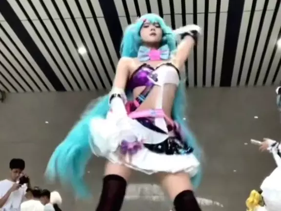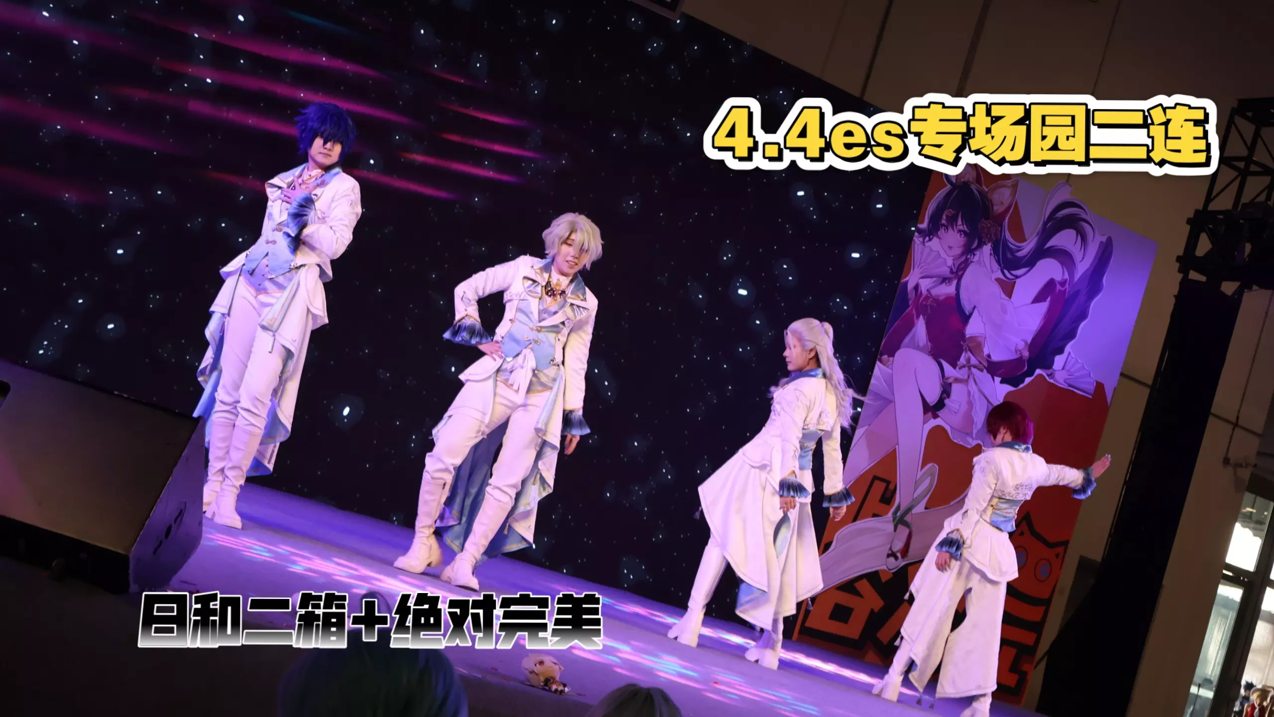 这是4.4南昌es专巴活动中的直拍内容,展示了cos偶像梦幻祭日和位的表演者跳宅舞《deepintoyou》的画面,现场灯光过曝让表演者看起来格外闪耀。