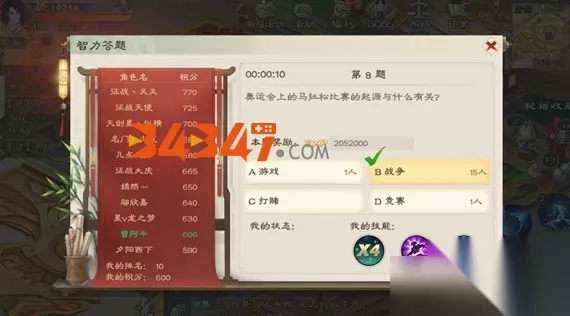 除了以上的道具外,玩家还可以使用经验加倍道具,该道具可以让你获得当前答对的题的经验翻倍。 技能可以在答题界面找到,看自己状态和当下技能,如果有人对你使用的技能,记得用防御罩,题目如果答错了,也没关系,一样有经验补偿,虽然少,但也聊胜于无,适当的使用技能能保证自己事半功倍嗷,答题结束后,奖励会发放到你的邮箱当中。