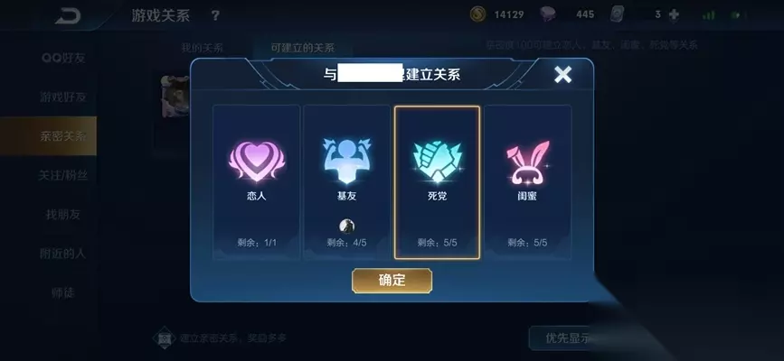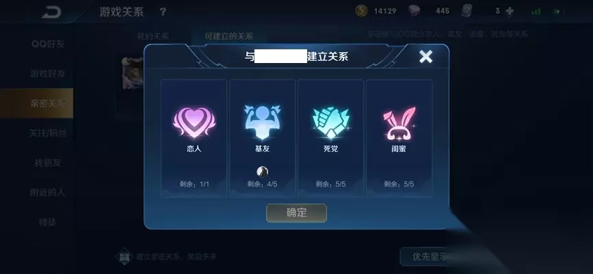 注意事项: 建立亲密关系需要亲密度100,可以建立恋人、基友、死党、闺蜜等亲密关系。