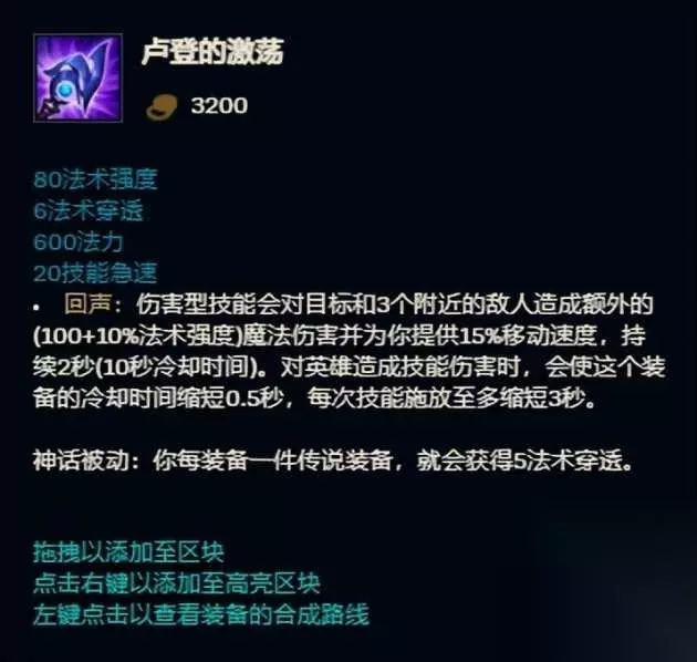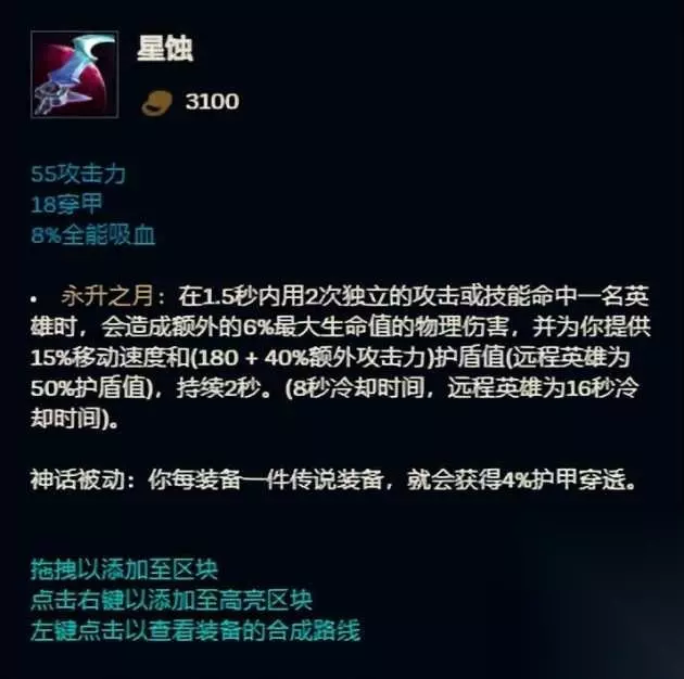 爆发伤害+法术穿透+移动速度+AP大爹 请问您寻找的是不是:卢登的激荡? 第4名 星蚀 出场率7.7% 胜率50.8%