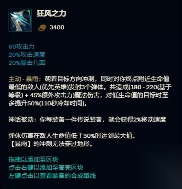 在这个确实对法坦英雄不够友好的版本,大家都只能被迫去玩输出法师,而影焰则是输出法师的核心,自带的20法术穿透和100法强,让大部分法师前中期打脆皮基本上全是真实伤害,名副其实的脆皮收割机。 第6名 狂风之力 出场率7.3% 胜率50.5%