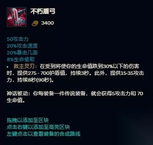 盾弓,没啥好说的,属于是万能的刺客和AD的生存保障装备了,在这个普遍伤害溢出的版本,盾弓能提供的比较均衡的护盾和攻击力也是相对优秀的。 第9名 无尽之刃