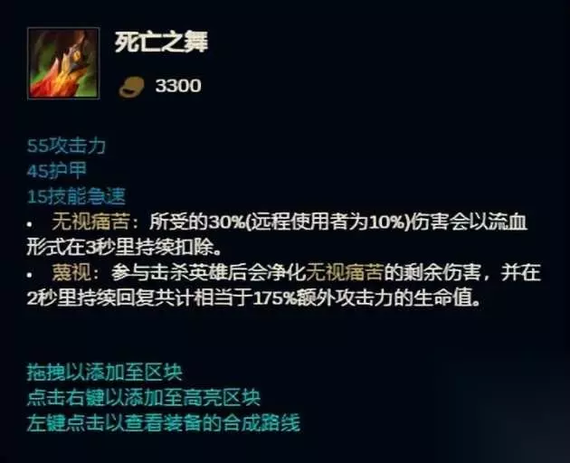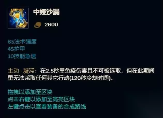 排名第二的死亡之舞是一件在这个伤害溢出的版本毫无疑问的能增加所有玩家容错率和游戏体验的装备,毕竟比起“我甚至都没有操作就黑屏了”更多人宁愿尝试“技不如人甘拜下风”。那你猜猜第一名是什么装备? 第1名 中娅沙漏 出场率12.9% 胜率54.1%