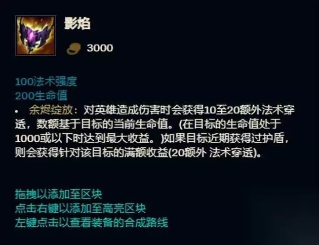 没啥好说的,属于是无尽的好兄弟系列了。这玩意基本上大乱斗ADC,刺客,轻装战士都是人手一件的级别。5%的处决加上暴击和穿甲,基本上就是脆皮噩梦。 第7名 影焰 出场率7.1% 胜率54.5%